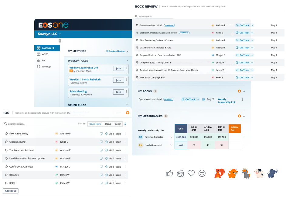 Streamline the rollout of the proven business operating system across your entire organization. Better communicate your vision, drive Traction®, and accelerate team health – simpler and faster – with the official software for Running on EOS.